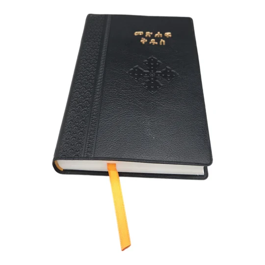 This Amharic Bible features a durable and stylish BLACK vinyl/PVC cover with a textured cross and intricate textured designs. The cover is both visually appealing and protective, ensuring the Bible remains in excellent condition for years to come.
